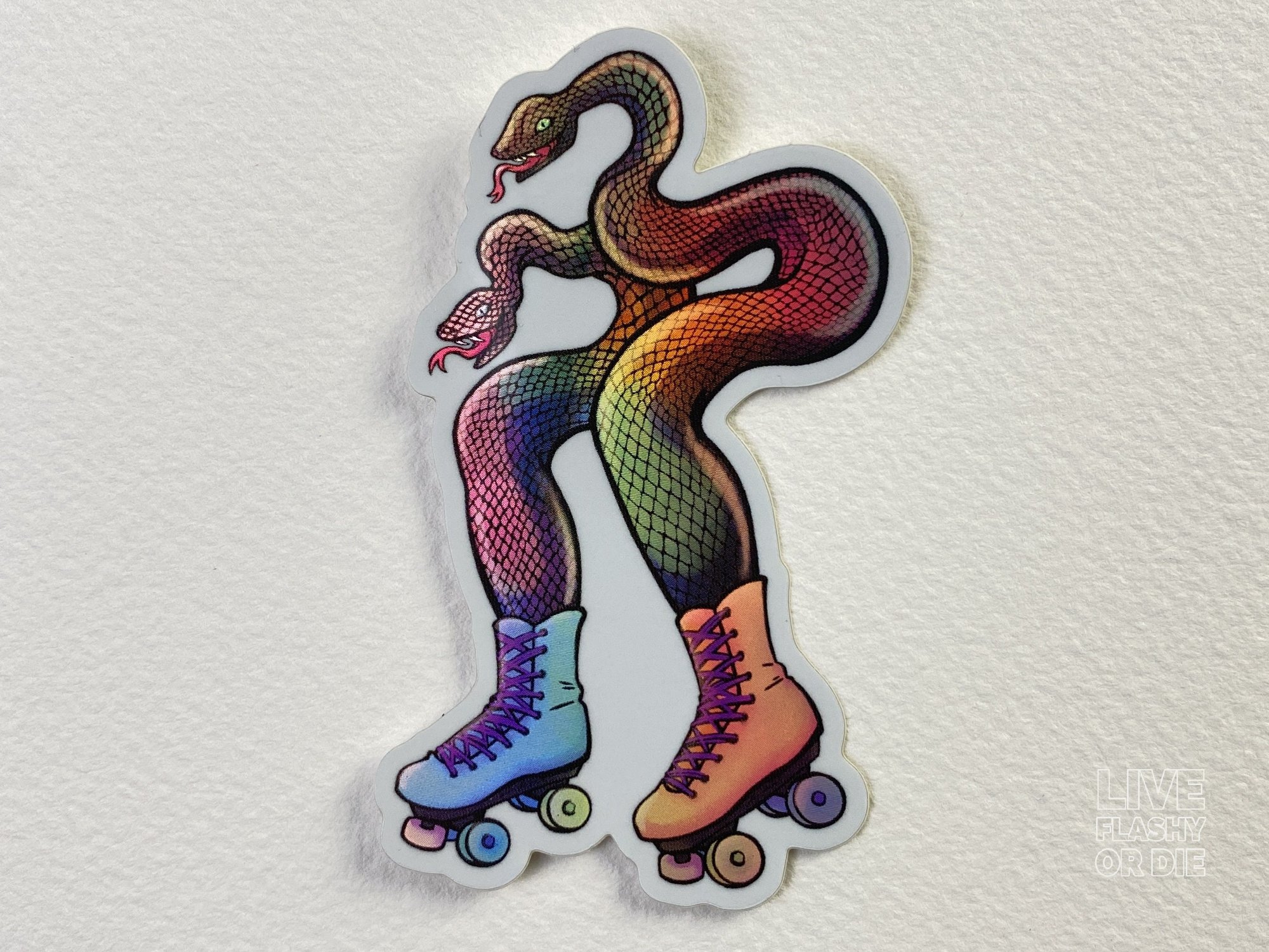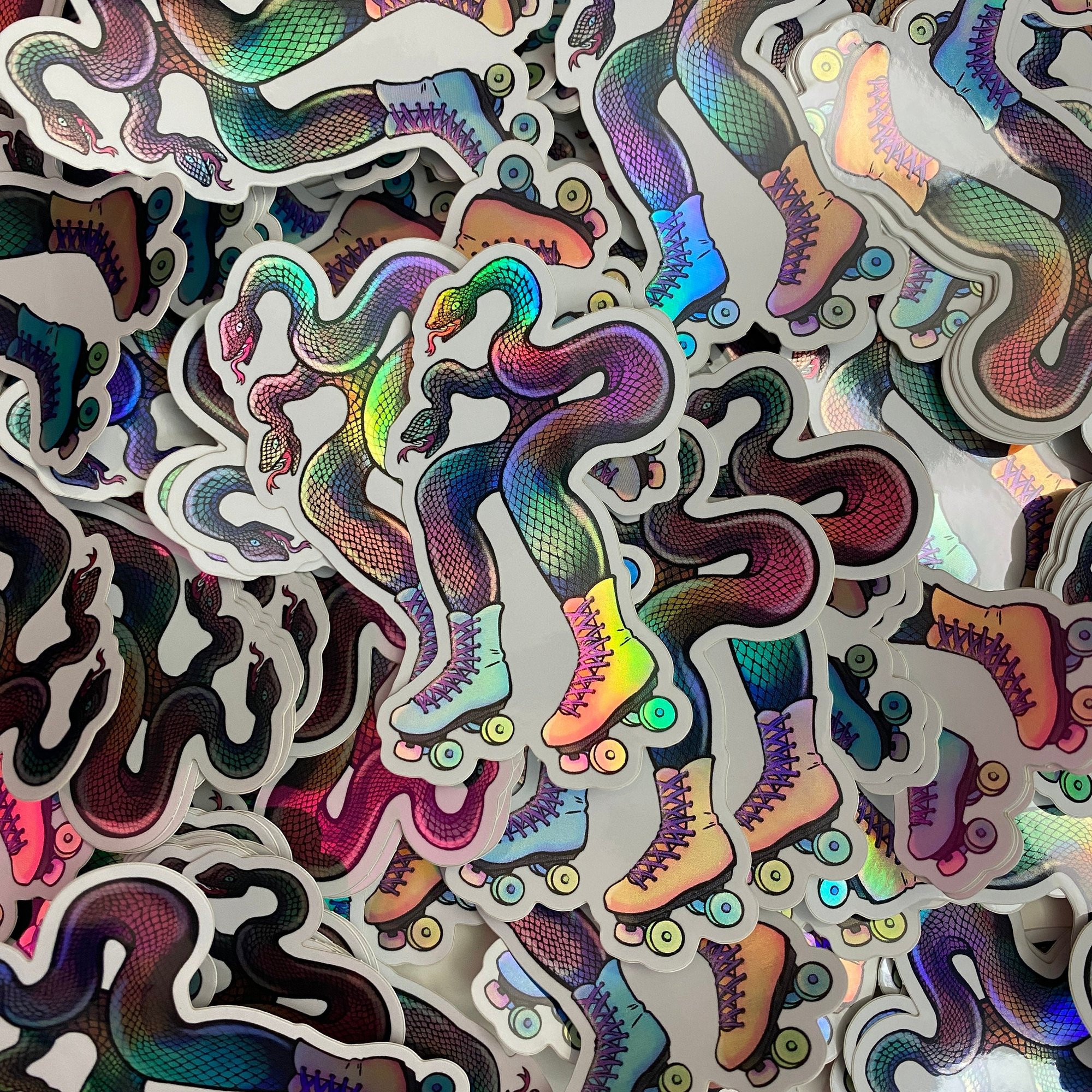 Snakes in skates out for a good time! Flashy and fun, these holographic stickers catch the eye on a sunny day or at the rink.