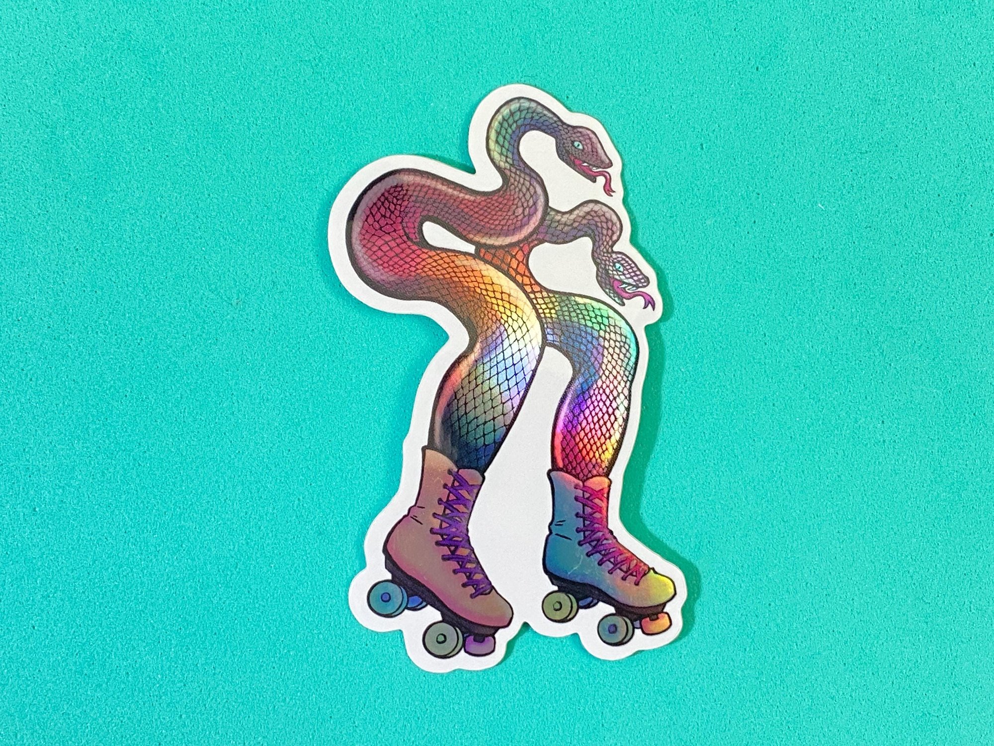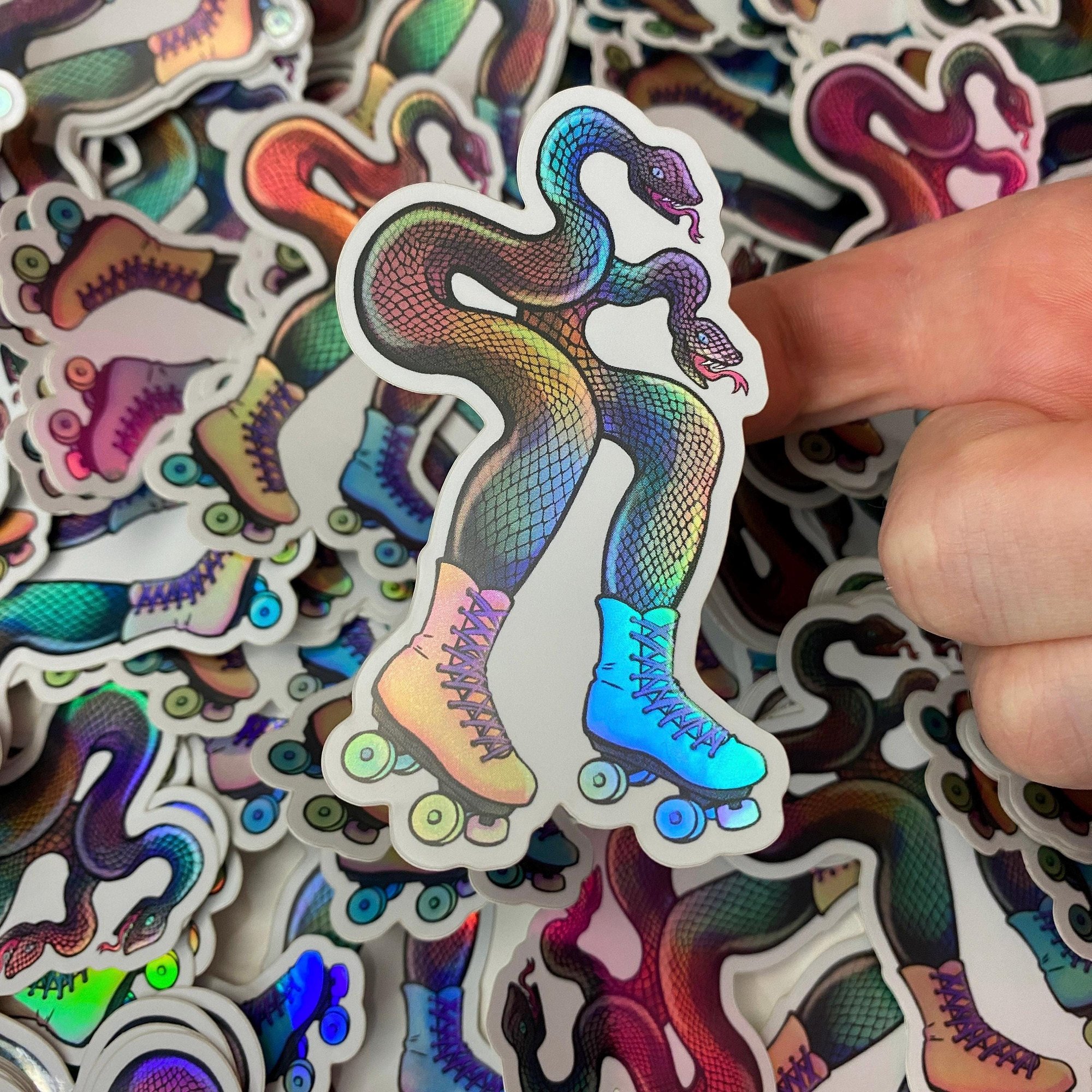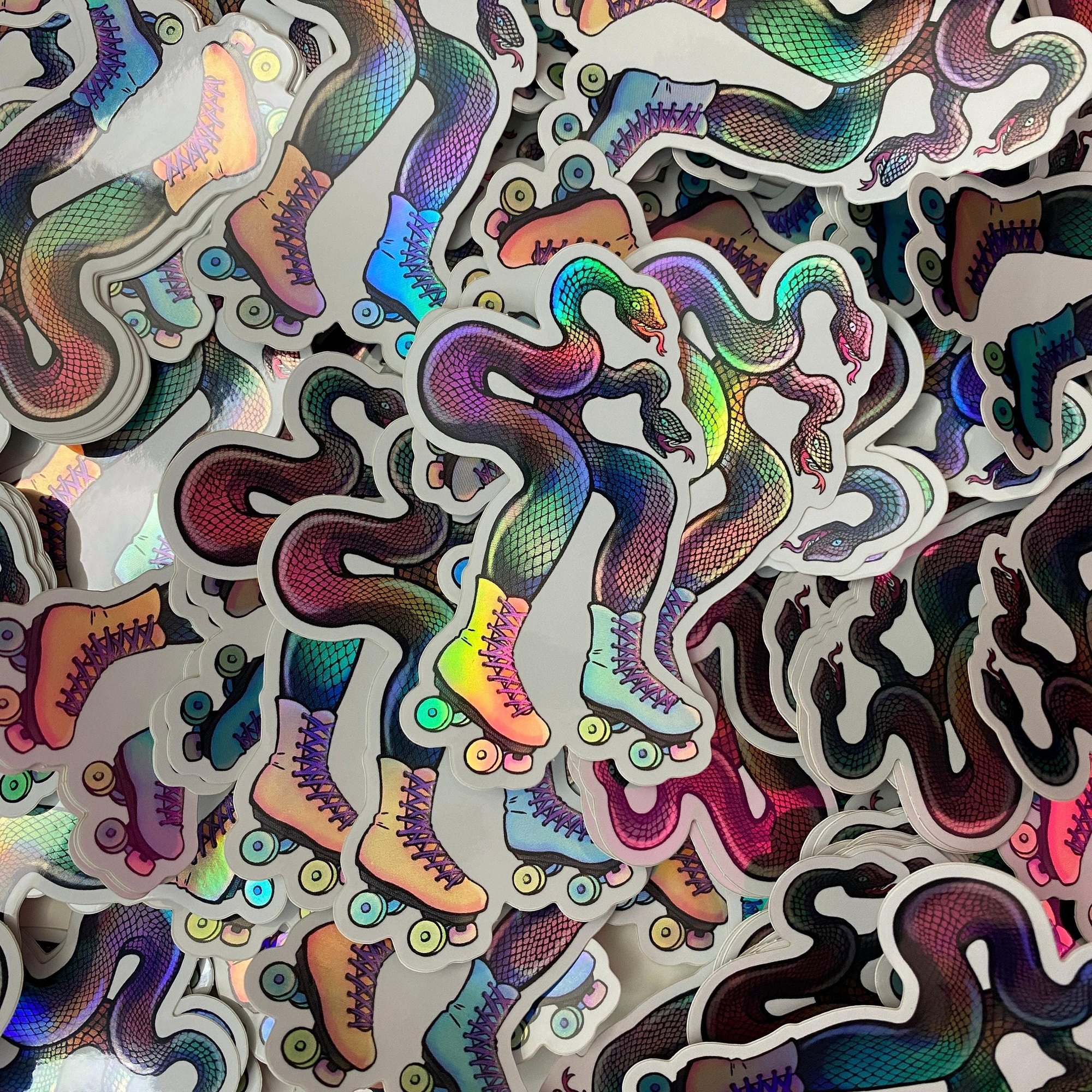 Snakes in skates out for a good time! Flashy and fun, these holographic stickers catch the eye on a sunny day or at the rink.
